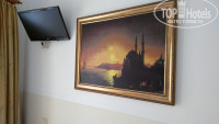 Далее идут номера, при заселении нам дали номер на первом этаже. На первом этаже с нашего номера открывался "потрясающий" вид на стену. В целом номер неплохой, В номере все необходимое: зеркало,холодильник, кондиционер, очень хорошая кровать), правда, теплого одеяла не было, только какое-то застиранное покрывало, минималистичный телевизор. Туалет соединен с душем, не очень сильный напор воды у душа. Мы постоянно были на море, и в принципе ничего страшного....Только душ староват, покрыт налетом черным...полотенца менялись))
