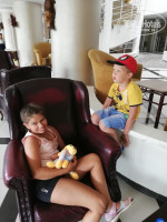 Приехали после девяти вечера, сразу отправили ужинать. Номер получили на втором этаже 104, угловой справа, если смотреть на отель (первый этаж номеров нет) с утра не жарко, с видом на соседний отель, но нас это не огорчило так как с видом на бассейн хорошо, но шумно из-за музыки... но там свои плюсы.. левая сторона отеля не закрыта соседним отелем и видно море. Если взять 4 или 5 этаж то, думаю, можно увидеть море хорошо везде. Номер просторный, мебель не новая, но и не ломаная. На полу мягкое покрытие. Телевизор, кондиционер, холодильник (без воды) Вода только в кулере у бара. В ванной жидкое дозированное мыло и шампунь или гель так и не поняла. Единственное что привело в замешательство это шкаф.. вешалки есть, но полок нет. Холодильник не работал.. посмотрел, покрутил пришедший мастер... не помогло.. сказал исправных нет, за три дня до отъезда холодильник заработал сам :). Балкон лоджия просторный, сушилки для белья нет, спасали стулья.