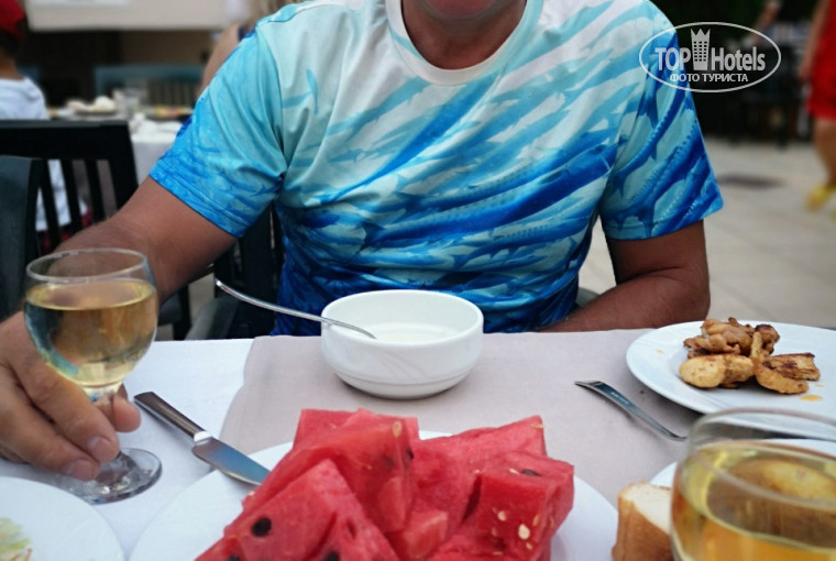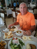 Еда- конечно для тех , кто совсем не ест курицу, было проблематично! Но голодным все равно не останешься! Утром, в обед и вечером обязательно крем-супы (вкусные особенно грибной), на ужин или обед несколько раз были борщ, щи, куриный суп(не суп-пюре). Куры были или на гриле, или жареные, или с овощами, снеки ...куриные сердечки с печенью , короче рай для любителей кур.... Рыбу дорадо давали всего 3 раза ...Да , не было плюшек на завтрак, но пирожные, всякие их сладости и муссы были всегда. Да, мало было фруктов! Арбузы стали дня за 4 до вылета, но апельсины, яблоки ( и частенько сливы )были всегда.....зелень, вяленые маслины, сыры.......надоело писать о еде!!!