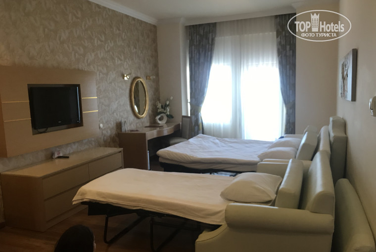 Всех приветствую! Выбрали этот отель по рекомендации нашего менеджера по туризму, с которым мы путешествуем каждый год на протяжении последних пяти лет и всегда остаемся довольны. После покупки тура выяснилось, что в этом отеле отдыхали моя сестра и подруга в разные годы, так что ехали с хорошим настроем. Итак, подъехали к отелю до 11 утра, нам сразу же выдали чёрные браслеты и тут же заселили( о чудо!). Жили 2 недели в двухкомнатном семейном номере на 3 этаже в основном корпусе (номер 6353) с видом на море. В номере было чисто, регулярно убирали и доставляли всё необходимое каждый день.Территория чистая и ухоженная, для малышей много развлечений. Мы ходили на отдельный пляж за мостом, мест всегда хватало. Пляж ухоженный, вода чистая. Еда в изобилии, голодным остаться невозможно. Мастерство поваров на высоте, давно не ела такую вкусную ачму, спасибо им! В основном ресторане немного суетливо из за количества гостей, но мне кажется еды хватало, из очередей наблюдала только раз- за какой то большой рыбиной, которую разделывали повара в зале.В ресторане для чёрных браслетов вполне спокойно и тихо, мы обычно там и ели.Особенно понравилась рыба на гриле, подавалась и на обед и на ужин, мясных блюд тоже много, сезон клубники и черешни в разгаре, поэтому дети с удовольствием поглощали в больших количествах).