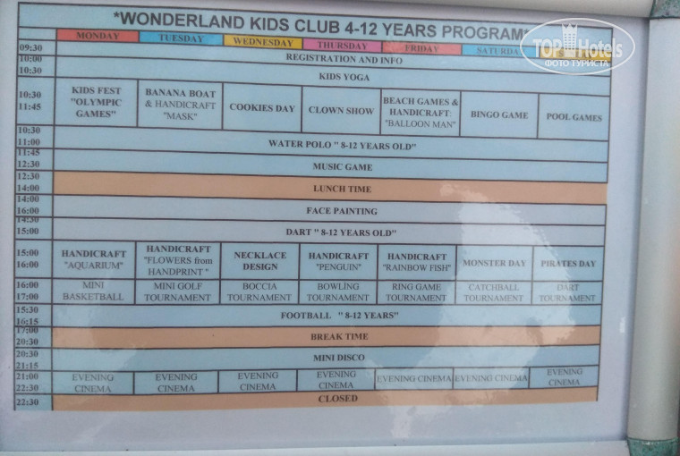 Огромный плюс отелю за детскую анимацию - девчонки аниматоры Аня и Алена просто большие молодцы - им самим действительно интересно заниматься с детьми, дети их обожают. На территории отдельная огороженная зона для детей (комната сна, детский бассейн с горками, игровая комнату, песочница, лабиринт, кинотеатр, карусель (платно), игровые автоматы (платно). Весь день детского клуба распланирован (расписание на фото), детям интересно. По вторникам и субботам детей катают на банане (платно).