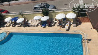 Чистый бассейн с лежаками и зонтиками—все в нашем распоряжении.