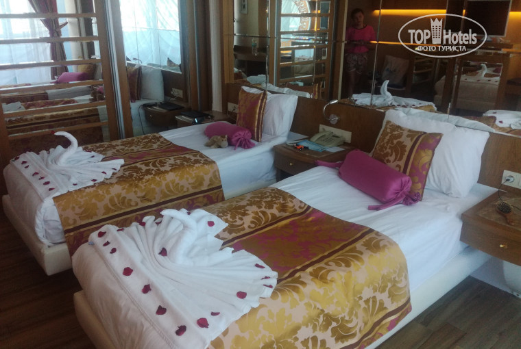 Вылет у нас был из Санкт-Петербурга авиакомпанией Turkish Airlines( хорошая авикомпания) в 4.15 утра. Соответственно, прилетели мы в Турцию раненько- в 8.утра. Порадовал индивидуальный трансфер от Анекса ,ехать из аэропорта Анталии до Аланьи ,где находится отель ,примерно 1.5-2 часа.с "технической остановкой" у всем известного магазина. В 10 утра мы наконец-то добрались до отеля. Как таковой встречи не было,гид передала нас в руки девушки с ресепшен и убежала. Нам дали заполнить карточки ,посмотрели сопроводительное письмо от ТОП Хотелс и вернули его обратно (по моему, оно им не интересно совсем). Показали карту отеля и отправили на поздний завтрак. Пока мы завтракали номер уже подготовили,так что в 11 утра мы стали счастливыми обладателями номера 3835 на 8 !!! этаже ( номер двухэтажный дуплекс ). Номер большой ,чистый ,красивый с балконом ,но вид был на дорогу.(шумно!) На втором этаже нет двери и около окна нет стены ,поэтому это не полноценная изолированная комната (кому это важно) вас, конечно, не видно ,но слышно. Да ,по поводу слышно. Слышно все и везде. В первую ночь пришлось идти разбираться к соседям .просить веселую немецкую компанию перестать так истошно визжать,орать и прыгать. Они извинились и продолжили орать,пока видимо не уехали . На утро их не было.