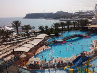 Бассейны есть:один с фантаном и один, где водные горки , а и для малышей. Территории ,конечно,как таковой нет. Отель ,бассейн , пирс,море. ни кусочка земли. Он как бы на обрыве построен. Но это не угнетало. Зато, все рядом ,дети сами везде ходили (не потеряешься). Отдельно хочу сказать спасибо спасателю на водных горках,он молодец! хорошо следит за всеми.