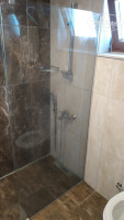 В душевой кабине нет поддона. Слив прямо на пол, на плитку и вода не вся уходила в слив, а просто разливалась по всему санузлу.