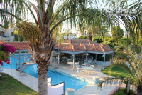 Отдыхали во второй половине июня, семьей с двумя детьми. Тур был от Библио Глобуса. На Кипре были впервые, водитель автобуса, что встречал туристов в аэропорту, был очень приветлив, как впрочем и персонал отеля. В отеле был русскоговорящий персонал (за исключением ресепшн) - горничные и официанты в ресторане. Территория отеля очень красивая и ухоженная, вся в цветах. Пляж прямо у отеля, но несмотря на то, что он считается городским, всегда были свободные лежаки, зонтики. Море конечно на любителя - очень мелкое, грязное от песка и водорослей, в общем как в Анапе. Мы жили в бунгало, на наш взгляд это лучше, чем проживание в большом корпусе, у бунгало свои отдельные бассейны, меньше народа, бар, не шумно. В номерах убирались каждый день, очень чисто, постель меняли раз в три дня, полотенца ежедневно, в достаточном количестве были гели, шампуни, лосьоны для тела, тапочки. Питание свежее, качественное, без замечаний, мясо, рыба, много оливок, овощей, разнообразных сыров и брынзы, вина местного производства не впечатлили. На завтрак все стандартно, каши, омлеты, яичница, сосиски, оладьи, овощи, фрукты. На ужин разнообразное мясо, рыба, фрукты, арбузы, мороженое, десерты, несколько раз был шоколадный фонтан. Анимация была несколько раз, кипрские народные танцы, фокусник, а так ежедневно только спокойная живая музыка. Детской анимации нет, детская площадка одна и своеобразная. Но и семей с детьми было не много, отель для спокойного и тихого отдыха. В целом хорошо организованы экскурсии, в том числе по святым местам. Если уезжали на экскурсию на целый день, то по просьбе с вечера, утром для нас были готовы ланч-боксы с разнообразным перекусом и водой. В день рождения в номер принесли открытку, фрукты и бутылку вина. В день отъезда вылет у нас был вечером, поэтому сдав с утра номер, оставив вещи в комнате хранения мы на автобусе (минут 15) доехали до Ларнаки и спокойно погуляли по городу, посетили Церковь Святого Лазаря, набережную, где стоят яхты, магазинчики и кафе. В общем отель безусловно рекомендую, кого не смущает мелкое и не самое чистое море.