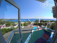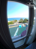 Новый номер (это широкоугольные фото). Доплатив 60 долларов, переезжаем на 4 этаж с видом на море. Холодильник начинает холодить, кондиционер уже с решетками, но все еще слабовато дует и слабо поддается регулировке температуры. Это связано с тем, что отель не новый, а после ремонта и кондиционеры висят старые (им уже около 10 лет). В целом вид на море + постоянный солнечный свет меняет все в лучшую сторону, единственное, балкон становится еще меньше. Я не знаю зачем там два стула и столик, если их там физически некуда поставить. Стены местами грязные, будто их старательно мазали маслом, но зато есть вентиляция в душе. Наверх ездят 2 лифта + лестница.