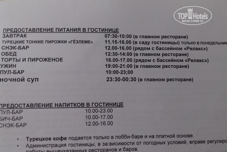 На территории отеля имеется ресторан «a la carte». Туда нужно записываться у девушки на ресепшене. Многие пишут, что не слышали про него. Но как, не слышали, если об это указано на сайте, в распечатке услуг отеля и гид на встрече об этом рассказывает… Всем советую обязательно там по ужинать. Жульен из морепродуктов, овощной салат, запеченная форель (или окунь), десерт из мороженного – все это приносят на блюдечке, за красиво нарытые столы у бассейна.