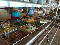 Завтрак с 7 до 10.30, шведский стол. Меню очень разнообразно: омлет, отварные яйца, запеканка, овощи, салаты, нарезка сыр/колбаса/ветчина, сосиски, гречка, макароны, отварная курица, свежий творог, йогурты, сырки глазированные, блинчики, каши в ассортименте, хлопья, выпечка, сметана, сгущенное молоко, масло сливочное, джем, чай, кофе, компоты и т.д. Проблем, где пообедать и поужинать не возникало, столовые/кафе/рестораны на каждом шагу! Но, перепробовав разносолы в других общепитах, мы все же остановили свой выбор на ресторане при отеле и ходили туда на обед и ужин - готовят вкусно и расположение удобно. Напротив отеля расположен аквапарк, детская площадка, торговые точки. Во многих магазинах можно расплачиваться картой. В шаговой доступности, минут 10 пешком, находится базар.
