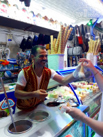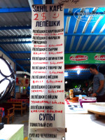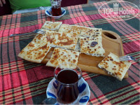 Бар работает с 12 утра. есть вода, 2 вида сока из пакетов и 2 вида сухого вина. Около столовой ( не могу назвать это рестораном) кофе-автомат и самовар (есть чай и кипяток), чашки, стаканы, сахар. На завтрак варят один вид каши, яйца, бывает омлет, 2 раза пекли на улице оладьи, есть зелень, салаты, тушеные овощи, жареная колбаса, ветчина, разные сыры и творог, молоко из пакетов с хлопьями и шариками, есть 2-3 вида варенья и вафельные корзиночки. На обед варят суп-пюре и жарят соевые снеки, сосиски, есть разные тушеные и свежие овощи, бобовые, зелень, оливки, соусы. Появляется арбуз (очень вкусный) и дыня(так себе), пару раз были сливы. На ужин также бывает суп-пре, одно мясное блюдо (чаще курица, печень, сердечки, один раз была говядина, один раз жарили скумбрию, была шаурма), овощи в различном исполнении, оливки, соусы, также арбуз, дыня, ещё крем (белый или шоколадный) и через день один вид простой турецкой выпечки (отдалённо напоминает медовик). Кухня старается, сервируют красиво, пытаются создать видимость разнообразия.