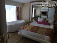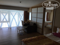 Получив ключи,мы направились в номер.Были поражены тем,что без всяких доплат нам дали двухкомнатный большой номер на 9 этаже с джакузи у окна и шикарным видом на море через панорамные окна на всю стену) Сразу же нам доставили чемодан в номер,показали и рассказали где и что.Сейф бесплатный,мини бар пополнялся каждый день,все исправно работало.Лифты не огорчали и не напрягали.От яркого вечернего освещения отеля спасали плотные шторы.
