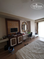 Номер нам достался с видом на другой отель, то есть жить приходилось постоянно с закрытыми шторами, поскольку в пяти метрах окна соседнего отеля.