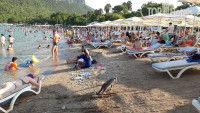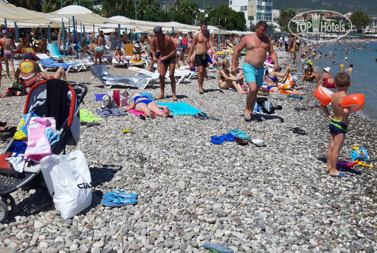 1. первое и самое главное: ПЛЯЖ - не свой! это общественный пляж, на котором есть лежаки, как бы нашего отеля, НО их продают всем остальным, приходишь, впереди уже лежат платные, а наши - где останется место. Ходят там все, кто хочет, в том числе и продавцы всякой кукурузы и т.п., вещи не оставишь. ТУАЛЕТА НА ПЛЯЖЕ НЕТ, предлагают сходить в Макдональдс, что?! Это отель 5 звезд, ультра!??? Бара и закусок на пляже нет, только куллер и автомат с напитками, а всё остальное - ПЛАТНО! На песчаном пляже домогаются в предложением о покупке пива, мороженного, кукурузы, могут нагрубить при отказе! Рядом на полотенцах лежат все желающие, в море еле пробиваешься, Анапа отдыхает! Фото прилагаю. Как я поняла, это проблема чисто Кемера, поскольку много самостоятельно отдыхающих туристов, точнее - в основном - они, "отельные" там не в своей тарелке. В ближнем Гёйнюке, да и в других регионах Турции, никогда такого не видела!