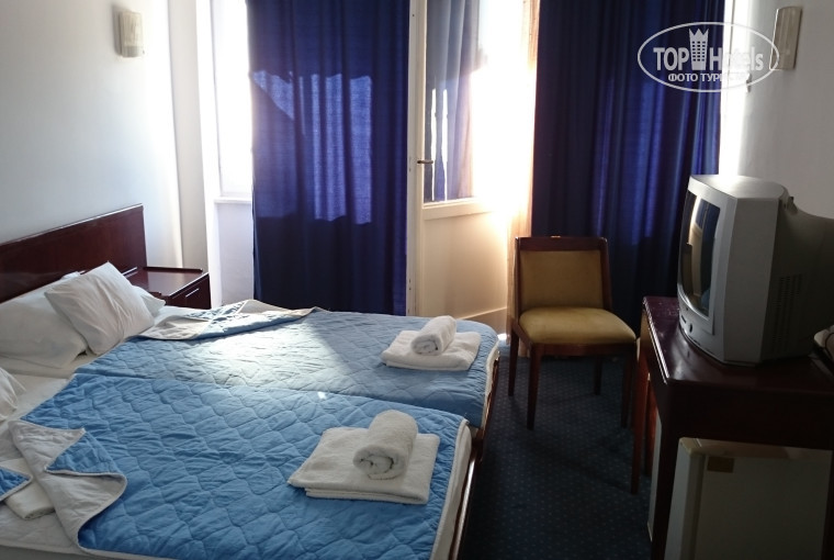 Номер нам достался 324 на четвертом этаже. Напротив лифта и чуть левее, иногда подскакивала от грохота двери лифта, так что будьте вежливы и придерживайте за собой дверь. Комната по площади небольшая, чистая и, что самое главное - в ней все работало. Телевизор с двумя русскими каналами, кондиционер, мини холодильник, сантехника (пусть и смыв унитаза на веревочке) - все исправно. То, что нет шторки в ванной и мебель старая - так это ж пустяки, абсолютно не заслуживающие внимания. Вода горячая в любое время и с хорошим напором. Кровати большие и удобные, белье чистое, балкон с видом и на море и на лес. От добрых людей осталась даже натянутая веревочка купальники сушить. На соседних балконах ее не было. Берите на заметку. Фена в номере нет, как нет и чайника со стаканами (один в ванной не в счет). Стаканы можно взять в баре. А вот кипятильник берите из дома. Чай дают только на завтрак, а в остальное время только за деньги (1,3 евро за пакетик).