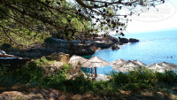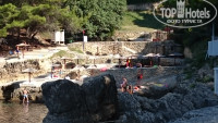 До ужина было время и мы решили сходить на море. Оно действительно рядом, только надо спуститься по множеству лесенок. По не знанию мы пошли сначала налево и попали на нудистский пляж, вернулись и взяли правее - пляж для всех остальных. Плиты ярусами и местами засыпанные галькой. Лежаки массивные, деревянные. Два лежака + зонтик = 5 евро (матрас еще 1 евро). Но мы за две недели умудрились ни разу не заплатить, т.к. собирать деньги начинали после 10, а мы к этому времени успевали належаться на жестком и меняли дислокацию. То на свежей мягкой травке полежим, то на теплых плитах посидим, поближе к воде, то в море купаемся. При оплате выдают чек, с ним можно целый день оставлять лежак за собой. Оплачивать можно наличкой и картой. Пляж компактный и открыт для всех. Местные в основном просто лежат на полотенцах или своих матрасиках. Это бесплатно. Рядом с пляжем есть два ресторана. Вход в море по лестницам: две вертикальные, одна под углом 45 градусов. Сразу глубоко. Но есть и подводные камни поросшие водорослями, так что надо быть внимательными, чтоб не заплыть и не ободраться об них. Можно еще поцарапаться о нижнюю ступеньку и о нижнюю часть трубы-перилы. Но если не торопиться, не толкаться и если Вас не толкнуть нечаянно, то останетесь целыми. Вода прозрачная, видно где камни, а где глубоко. Народ активно прыгал со скал вниз головой. При нас все благополучно выныривали. До обеда, как правило, вода была чистой. Только один раз был слив какой-то жирной серой хлопьеобразной мерзости. Надувная подушка сразу стала будто салом намазана. Еле отмыла с хозяйственным мылом. После обеда часто плавал растительный мусор (трава, водоросли). Но у буйков вода оставалась чистой и даже теплее. Вообще надо сказать, что море там холодное, даже во второй половине августа, когда стоит жара 30-37 градусов. Если сначала вода была прохладной, когда в нее погружаешься, а потом вроде привыкаешь и можно долго купаться, то на второй неделе подошло холодное течение, и пару дней море было прям очень уж бодрящее. Волн там нет, можно плавать на различных надувных приспособлениях. Народ плавал в масках и ластах. Маски, матрасики-лежанки, надувные круги можно купить в городе.