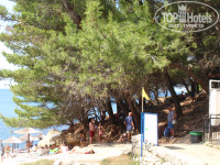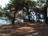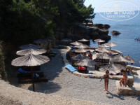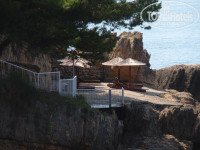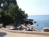 А если выйти из отеля, спуститься по первой лестнице и пойти налево от стоянки машин в лес, то можно дойти сначала до рыбного ресторанчика, а спустя час с момента отправления, преодолев лесные тропки, отвесные участки скалы и если не оступишься и не улетишь с обрыва (ограждений нет), то можно дойти до Велика плажа - пляж с темным песком, дорогими лежаками и еще более холодным морем. Мы пошли в пляжных тапках. Обратно рисковать не стали и прокатились на лодочке за 3 евро с человека. Лодка сажает прям у берега с воды. А мы были на пирсе, где можно причалить, помахали рукой и нас подобрали. Довезли до городского пляжа в Ульцине, т.к. к нашему пляжу нельзя причалить. Совет: захотелось на Большой пляж - иди в город, покупай билет на лодку за 4 евро (это если билет и туда и обратно сразу) и любуйся местными красотами в безопасности и комфорте. Не стоит идти пешком и рисковать своим здоровьем, а может и жизнью. До хижины вполне удобная тропа, вот по ней можно погулять. Кстати рядом со стоянкой в лесу возле тропы растет ежевика. А в деревьях стрекочат цикады громким ором. Видели один раз черную белочку. Природа красивая, воздух чистый - вот преимущества этого отеля, находящегося в стороне от города. Если б еще с соседнего пляжа не доносилась восточная музыка, то прям вообще благодать.