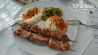 У нас был полный пансион. Завтрак - шведский стол со вкусной колбасой видов 5, сырами и вкусным кофе из автомата, соки натуральные (апельсиновый, яблочный, грейпфрутовый). Уж весь ассортимент перечислять не буду. Обед и ужин по меню. На листочке на русском языке предлагали два вида супа, 4-5 вариантов второго, салат и 3 вида десерта. Отмечу, что все мясное на гриле невероятно вкусное. А какой изумительный шницель в панировочных сухарях и с долькой лимона, а какие нежные и сочные котлетки, фаршированные сыром, нежнейшая отбитая и неотбитая телятина... ммм... Как мне уже не хватает этого рая для мясоеда! Арбузы великолепны. Помидоры с потертым на крупной терке сыром восхитительны. Порции огромные, я гарнир не осиляла. Гарнир всегда из трех составляющих: рис, вареные или тушеные овощи, картошка фри или пюре. Рыбу два раза давали (хек). Из столовой буквально выкатывались. А в обед порция мяса больше, чем вечером. Сказка!