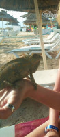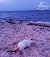 Пляж: 5 минут пешком по грязной улице (на повороте есть магазин с сувенирами, сумками, шлепками и прочим). Если придти к 7 - 7.30 утра, можно занять место под зонтиком, притащить себе лежак, можно раздобыть себе матрас. Где-то около 9 часов заканчиваются зонтики и матрасы, а после 10 нет свободных шезлонгов. Шезлонги пластиковые, матрасы после дождя мокрые (их сваливают один на другой с вечера, поэтому шансов высохнуть у них нет). На пляже есть стойка с хим.напитками, кофе, чай, вода, фанта, кола, спрайт. Перекусов на пляже нет (для тех, кто с детьми это может быть важно). Есть кафе, но работало оно только по вечерам и оно - платное. Делали вид, что убирали водоросли на пляже, но недолго.