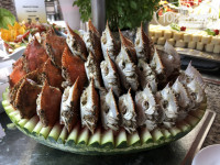 Питание... Странное сочетание: с одной стороны, блюд много - и рыба, и мясо, и овощи - но почти все невкусно. Мясо почти всегда очень жесткое и малосъедобное, рыба сухая, приготовленные на гриле продукты пережарены, салаты ужасны. Правда, было много морепродуктов, которые я не люблю, поэтому о их качестве сказать ничего не могу. Конечно, голодными мы не оставались, но приходилось выбирать для себя что-то подходящее. Зато в изобилии были фрукты: арбузы, дыни, сливы, виноград. Вино и воду давали бутылками: вино белое, розовое и красное, без ограничений; вода с газом и без газа. В главном ресторане ничего сам себе не наливаешь, в ресторане на пляже - стандартный автомат с напитками. В Египте сталкивалась с неприязнью и подчас игнорированием заказов алкоголя, а здесь ничего подобного нет, все быстро и очень доброжелательно. На ужин, например, мы садились за один и тот же стол, и официант сразу приносил нам вино "как обычно", всегда следил, чтобы всего хватало, не испытывали недостатка в его заботе.