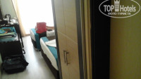 Территории нет.Бассейны грязные.Купаться ее рекомендую.Дети ловят ротовирус в них.Воду в кулеры и в бутылки на столах в обед и ужин наполняют из водопровода.Поэтому не разрешают выносить воду из столовой,чтобы использовать пустые бутылки вторично.Рекомендую выносить в сумках бутылки и уничтожать их.Тогда персоналу придётся выставлять новые в заводской упаковке. С правой стороны от входа в отель, в номерах хорошо слышны крики муллы ,так как динамики расположены с этой стороны отеля.Кто спит чутко- это важно.После отъезда подавляющего числа отдыхающих турок 1 сентября (видимо на учёбу с детьми ) питание резко ухудшилось.(Кстати за 2 недели отдыха баранина была 2 раза по понедельникам в турецкую ночь,плюс печень или почки.Типа праздничный стол.На следующий день доедали..В остальные дни - птица,рыба,соевые котлеты.Соли не жалеют.Время приёма пищи неудобное:8-10 завтрак,12-14 обед,19-21 -ужин.Мест в столовой не хватает,отсюда очереди .Через час места появляются, но столы грязные,не сервированные,воды нет, ассортимента уже нет.Многие блюда холодные,макароны всегда холодные почему-то.Первый раз за 17 поездок в Турцию в столовой не делали картошку фри,только на пляже в обед.) Начались также перебои с мартини,белизом, баккарди и др напитками в баре,хотя бар круглосуточный.Налицо наплевательское отношение администрации к русским туристам в смысле питания и напитков.Пляж нормальный ,но убирается плохо.В баре там нет алкоголя и пива.Мест хватает. Матрасы БЕСПЛАТНЫЕ.Вход в море опасный, плиты скользкие.С детьми и пожилым, а также неуклюжим людям очень проблематично зайти в море без травм, особенно,когда волна,без кораллок не зайдешь вообще.Слева по ходу на море есть более-менее пригодный вход.Подземный переход к морю ужасный,с колясками не пройдете в одиночку.Угол наклона 45 градусов.Убиться можно и молодым,здоровым.Не пускайте детей бежать без вас в подземный переход,полетят вниз кубарем мимо ступеней по наклонной плоскости на глубину не меньше 5 метров!!! Из деревянного настила в душе на пляже постоянно вылазят шурупы ,можно поранить ноги.Будьте осторожны,особенно дети.Обслуге на это наплевать,после замечания взяли камень с песка ,забили шурупы обратно в доски,хватило на 10 минут,снова повылезали.Пляжные полотенца за депозит, потом вернут (5 долл).Анимация слабая.Во втором корпусе,где мини клуб для детей в холле постоянно открыты окна вровень с полом ,выходящие на узкую крышу, с неё обрыв на минус первый этаж.Если ребёнок побежит ,выскочит случайно в окно,то неизбежно упадёт вниз и травмируется.Следите за детьми! !!