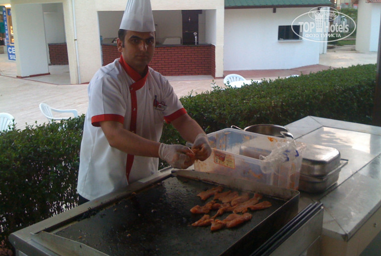 Хорошая, твердая пятерка (если кто-то имеет сказать против, смотрите на количество звезд и стоимость тура ;). Питание вкусное и достаточно разнообразное, местный шеф имеет пунктик по всяческим рагу с курицей, субпродуктами (это отдельная тема), по крайней мере за 10 дней повтров не было. Через день готовят мясо или рыбу на гриле прямо в ресторане (рыба правда так себе, ее похоже не умеют готовить нигде в турции). На завтраки через день жарят блинчики, яичницу. Каждый день жарят педе (открытый пирог с сыром, мясом итп). Соевое мясо есть в виде сосисок, котлеток, фрикарделек, но как говорится, не хочешь - не ешь, всегда есть альтернатива. Овощи - огурцы, помидоры, редька, редис, баклажаны, лук, оливки, капуста: пекинская, белокочанная, краснокачанная, морковь, вобщем все есть в чистом виде и есть в во всевозможных салатах. Фрукты - апельсины, грейпфруты, лимоны. Соки , если их так можно назвать, чистый ЮПИ ;) Чай (зеленый, черный, бергамот), кофе, какао, спрайт, фанта кола. Спиртное - сколько унесешь ;-) Красное и белое сухое вино - качеством как вино из российских тетрапаков. Мы с женой просто любители ракии, поэтому за другие напитки не скажу, пиво эфес, ктрадиционно вкусное, ракии не золотого качества но и не самое копеечное, так что вполне употребимо. Хотел еще отметить лепешки которые печет дама средних лет, (бар возле ресепшена, там где телега стоит), очень вкусны. Бар на пляже - напитки все о которых говорили ранее кроме вина. Овощи, картошка фри, котлеты для камбургеров, булки для гамбургеров.