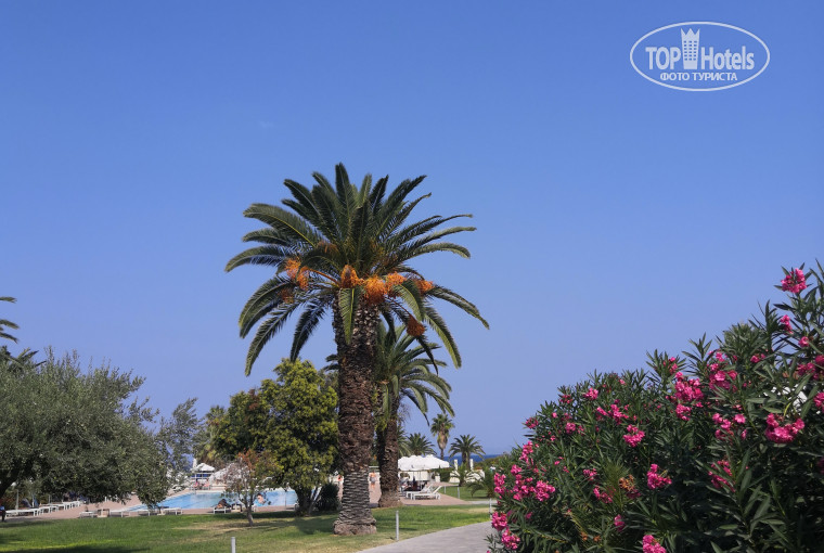 Это конечно, безусловно, территория отеля. По этому плюсу и выбрали данный отель. Каждый день несколько садовников ухаживают за территорией. Красивые пальмы, оливки, мандарины, финиковые пальмы, розы, азалии и много других. Одно удовольствие выходишь на балкон и любуешься.