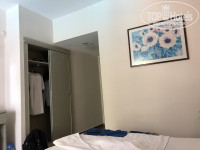 Внутри одна односпальная кровать, одна двуспальная, зеркало с полкой, одна тумбочка, мини-холодильник, мини-телевизор(LCD), в коридорчике вешалка для белья и несколько полок.
