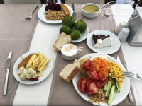 Завтрак 7.30-10.00 каждый день можно увидеть на столе: яйца вареные, омлет, молоко с хлопьями/шариками, суп-пюре, джемы, сыры, овощная нарезка, зелень, блинчики иногда, омлет, сосиски соевые, тушеные овощи, фасоль.