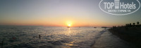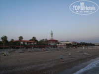 Пляж песчанно-галечный. Пирс у отеля никакой по сравнению с соседними отелями. Слева от пирса заход в море плохой так как выступает плита, справа покомфортней, но глубина наступает быстро через 3-5 метра. Свободные лежаки можно найти всегда. С погодой повезло дождь был вечером один раз, пару дней море штормило, температура вода была 26-28. Очень удобное время выдачи/замены пляжных полотенец непосредственно на пляже с 8-00 до 18-30 и в аквапарке в течении всего времени его работы.