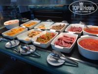 Завтраки :яичница(глазунья,омлетом и просто отварные) блины , пирог картофельный,фасоль в томате, колбаски, конвертики слоеные с разной начинкой,,картошка типа фри, хлопья и шарики,молоко и еще было НЕ молоко. Кофе из аппарата, но вкусное крепкое. Также в аппарате соки. Джемы,масло,маргарин, сыр 2-3 вида , мясная нарезка 2-3 вида, пашет, Помидоры ,огурцы, грибы жаренные ,перец болгарский тушеный,пекинская капуста ,руккола. Хлеб разных видов. Фрукты: арбуз,дяня,яблоки,слива,апельсины,груши бананы.