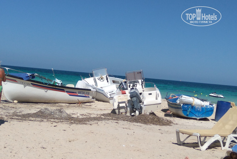 Пляж. Вот это разочарование. Пусть не близко, трансфер работает прекрасно, но что ж он (пляж) такой убогий то? Не убирается совсем, детский обделанный памперс красовался в цветочном горшке все время нашего пребывания. В душе горы песка, вода есть не всегда. На маленьком пяточке отведенном под пляж, львиная доля территории занята платными шатрами. Бар огромный платный (по площади), в нем баночное, бутылочное пива, вино в бутылках расставлены реденько так (муляж?). Бар бесплатный с витриной как у моей бабушки в деревне в 70-х годах, туда пиццу приносят. Из напитков только юпи. И без того малюсенькая акватория огороженная для купальщиков бессовестно эксплуатируется конторой-прокатом с лодками, катамаранами. Готовы по голове твоей промчаться. На наших глазах они задели немца, так практически драка началась. Охранники с нашего пляжа растаскивали. Тунисцы из проката вели себя нагло, они и лодки и машины свои ставят на пляже. Само море очень зависит от погоды. После шторма огромное количество водорослей, их убирают, но не сразу (ждут когда горы образуются), поэтому они болтаются в воде и купаться неприятно. Лежаки и зонтики уже пару сезонов назад нужно было поменять. Совет - если на пляже горы травы, не поленитесь, пройдите по побережью вправо, там отель с прекрасны пляжем, убирают все и сразу, мелко, прозрачно и очень мягкий песок.