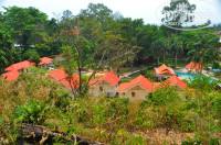 Вторая линия (за дорогой, ближе к джунглям, вернее очищенная от джунглей, часть деревьев оставлена) по площади значительно больше и свободнее береговой (первой). Там расположено: по периметру, если стоять лицом к дороге (морю), напротив ресепшена проезд на вторую линию, по бокам которого два больших пруда с рыбами, предполагаю, что в дождливый сезон они (пруды) полные воды, в феврале эти пруды были заполнены водой максимум на треть. Далее, справа двухэтажное административное здание (на первом этаже стоянка для автотранспорта), также по левой стороне пара – тройка подсобных помещений (похожих на сдвоенные бунгало) для обслуживающего персонала и дальний правый угол – пятиэтажное здание с номерами для отдыхающих. Слева, от проезда (если стоять лицом к ресепшены), большая, местами тенистая, зелёная территория и только по дальней части периметра, расположен бассейн и 10 бунгало. Шесть отдельно стоящих и два сдвоенные (т.е. для заселения большой семьи с внутренней дверью между номерами). Дальше, только гора с дикими джунглями. Ну, если быть объективным, то не такие уж они и дикие. Дорога, разделяющий вторую линию, уходит вверх, в гору и заканчивается метрах в 80-100 выше бунгало, двухэтажным зданием где, вероятно и проживает обслуживающий персонал отеля. А также, на горе, подготовлены три площадки под строительство. Но это видно, если подняться по дороге вверх, если смотреть от бунгало в гору, то ощущение реальных джунглей. Несколько раз прибегала стайка обезьян, гекконы бегают, особенно в тёмное время, присутствуют «звуки джунглей» (непривычные нам крики, звуки, писки…).