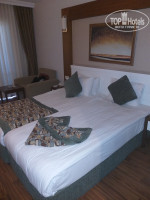 3. Номера. Про весь номерной фонд не знаю, но нам попались два двухместных номера, оба с одной двуспальной кроватью и раскладным креслом. Еще из мебели - шкаф для одежды (кстати, первый отель из 10 мною посещенных в Турции и Египте, в котором было аж 8(!!!) вешалок-плечиков, обычно их 2-4 шт), столик, трюмо, на балконе столик и два пластиковых кресла. Санузел стандартный, чистенький. Единственный момент - в душевой не просто поддон низкий, а ванна, это может быть неудобно пожилым людям. Кондиционер у меня в номере работал исправно, а у моих друзей - не очень. Пришлось решать вопрос с администрацией. Как выяяснилось, система кондиционирования там требует ремонта, не все номера охлаждаются одинаково хорошо.