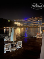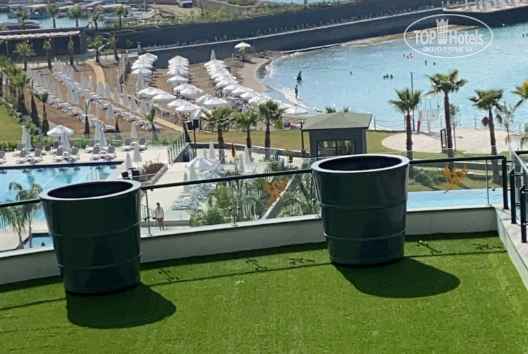 Отель не тусовочный. Больше семейный. С детьми там прямо кайф. И большая детская площадка, и мини аквапарк и большой аквапарк. Вход в море очень пологий, однако рекомендую взять тапочки. Много камней на дне. Будьте аккуратны. Хочу отметить, мы ни разу не порезались и не поранились, но факт , что они есть. Меньше всего камней по центру и справа. Для тех, кто любит воду почище и глубину есть шикарный Пирс. С него удобно входить в воду. Так же есть классные бунгало. 10 евро с человека - сервис напитков, 25 полный сервис с питанием.