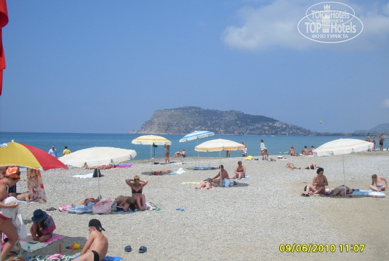 Пляж ухоженный и чисты. Море класс. Очень соленое по сравнению с Черным. Прозрачное, рыбки плавают. Матрасы (2шт.) и зонт платно – 4$ или 5 лир на весь день. Хоть и уходишь куда, приходишь говоришь, что покупал – без проблем пользуешься. Многие загорают без них, или на шезлонге или на полотенцах, как кому нравиться. Напитки типа Юппи на пляже бесплатно.