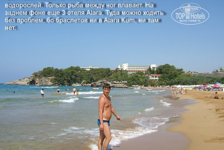 У этого отеля очень здоровский пляж, пусть он по территории небольшой (точнее тот участок где стоят лежаки), но никто не запрещает купаться на всем побережье. Кстати, данный пляж считается одним из лучших на песчаном побережье Турции, в том числе так считали и отдельные туристы, которые за время нашего отпуска успели побывать на других пляжах, в том числе как и мы на знаменитом пляже Клеопатры в Аланье. Глубина на пляже начинаетяс очень плавно, так что для маленьких детей пляж то что надо.
