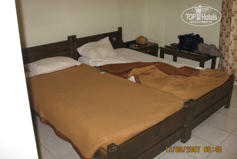 Скажу я вам, ребята, что я никогда не был тонким ценителем роскошных отелей, поэтому всегда брал исключительно 3*. Нет, ну а зачем деньги тратить? Ну чистенько, ну сантехника исправная, ну мебель нормальная, не обшарпанная, хоть и не в стиле «Ампир» - вот что я примерно имел в турецких, египетских и тунисских трешках, а что еще надо? Поэтому я никогда не понимал людей, которые начинали морщить нос при упоминании трехзвездочного отеля. «С жиру бесятся!» - так я думал. До того как вошел в свой номер. Так вот они, оказывается, с чем сталкивались в трешках! Странно вот только, что греческая трешка оказалась мрачнее, чем в вышеупомянутых странах. Мебель там довольно обшарпанная, примерно как в совковой общаге, балкон выходит во внутренний дворик («колодец»), откуда, кстати, без проблем можно перебраться на соседний балкон (лично проверял! :-D), балкон закрывается дверью с жалюзи, либо со стеклом – на выбор. Смесители похожи на совковые, из крана капает вода (хоть и редко), в углу притаился паучок (да не волнуйтесь – не каракурт! :grin: ). Когда я на следующее утро захотел помыться, горячей воды не было. Я включил воду, пытаясь ее слить, т.к. после этого зачастую начинает идти горячая вода, но это помогло слабо. Правда, как потом выяснилось, это уже проблема всего Крита, а не только отеля «Димитрион», т.к. электричество там получают от солнечных батарей: другие способы очень дороги, поэтому вода утром просто не успевает прогреться. В общем, рекомендуется вставать не раньше 7:30 – тогда горячая вода уже будет. Номера убирают каждый день, но белье меняют раз не то в 2, не то в 3 дня. Но что меня больше всего поразило – это телефон. ДИСКОВЫЙ! Я думал, такой остался один во всем мире – тот, что до сих пор где-то валяется у меня в антресоли. :grin: Однако надо сказать, что номер очень спокойный, ночью там очень тихо, если соседи не буянят (а такое пару раз было – какие-то девушки (русские) пару ночей очень много выпивали, отчего у них конкретно сносило крышу).
