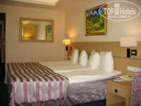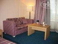 Номер большой по площади, уютный, разделён на зоны, зона отдыха с журнальным столиком, креслами и раскладным диванчиком, с ковролином другого цвета и на возвышении в 15 см.