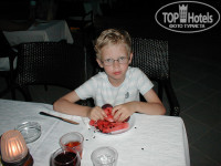 Сынок у меня часто брал в полдник пицу,гамбургеры(но в гамбургерах мне котлета на понравилась),потом какие то очень вкусные мясные конвертики,картофель фри.В полдник также было различное печенье,пончики жарили с вареньем.Из спиртного пробовали пиво(хорошее) и сухое вино(терпимо).Вечером всегда овощи и мясо на гриле,очень вкусно, очень вкусный морской коктель,там рыба+овощи.Шаурма также была.Из напитков соки юппи- гадость,а так кофе разное,спрайт,кока кола,фанта.Фрукты черешня,арбуз,яблоки,апельсины,сливы,в последний день давали бананы маленькие королевские,вкусные.Давали мороженого,но мы не разу не брали.