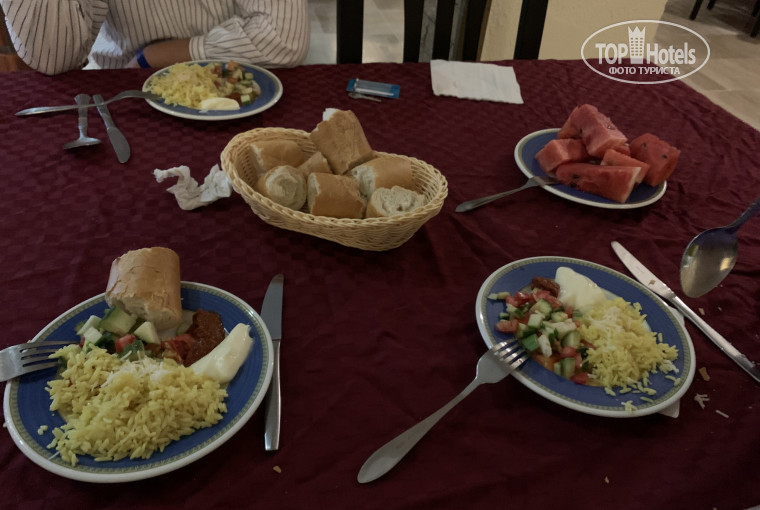 В отеле нет шведского стола, выносят несколько тарелок, едим что дают, но это не было бы большой проблемой, если бы еда была разнообразная. На обед и ужин давали одни и те же блюда, одинаковые макароны с соусом и суп давали в один день. Выбрать ничего было нельзя. На десерт - несколько кусочков Арбуза и то не каждый день.