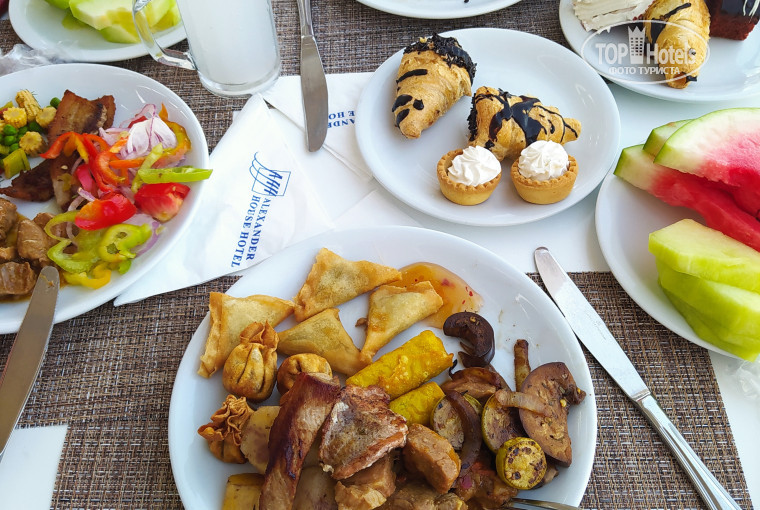 +ассортимент средний, но всё вкусно, морепродукты на ужин (кальмары, креветки, мидии, улитки) не каждый день); десерты, картофель, макароны, мясо, рыба, арбузы и дыни-каждый день.