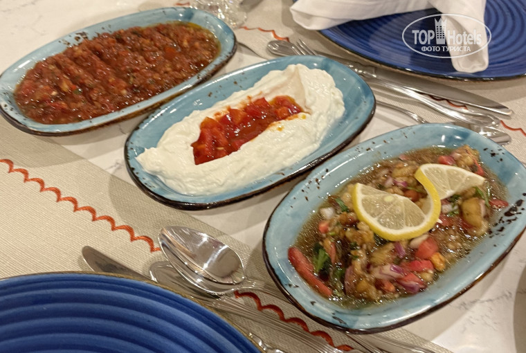 Еда: Мы остались очень довольны. Выбор: Каждый всегда найдёт что покушать. Из мяса была курица, индейка, говядина, баранина, перепела и блюда из фарша. Из рыбы была форель, скумбрия, тунец, морской лещь, селедка, дорадо. Рыба, как и мясо были приготовлены разными способами. Мы застали рыбный вечер с морепродуктами. Из морепродуктов были креветки, мидии, щупальцы осьминога и кальмары. В ресторане очень вкусная выпечка. На территории отеля много мест, где можно перекусить. Мороженое дают на пляже и около основного бассейна.