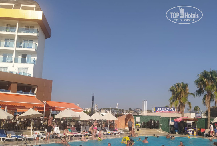сама территория небольшая,но уютная и зелёная, имеется бассейн с горками, взрослому человеку спокойно можно прокатиться, по еде претензий у меня нет, мясо,рыба были всегда на ужин,на обед в ресторане! Овощи фрукты всего хватало голодные не останетесь, рыба ежедневно!По спиртному как обычно во всей Турции на любителя, но пиво как всегда на уровне.пляж маловат, но так как мы приходили к 8.45-9.00 место всегда находили позже может быть все занято!На пляже можно отведать вкусного мороженого, рекомендую. Лежаки,зонтики с этим нет проблем.Есть анимация с утра до вечера,утром подвижные игры, развлечения.Вечером детская дискотека, взрослая...караоке...и другие развлечения.Состав аниматоров очень даже неплохой,ребята не дадут вам заскучать.(спасибо Вене за команду)В целом мне понравилось ехать можно если не придераться к интерьеру в номерах, так все понравилось!! Спасибо за отдых на Турецкой земле и людям!