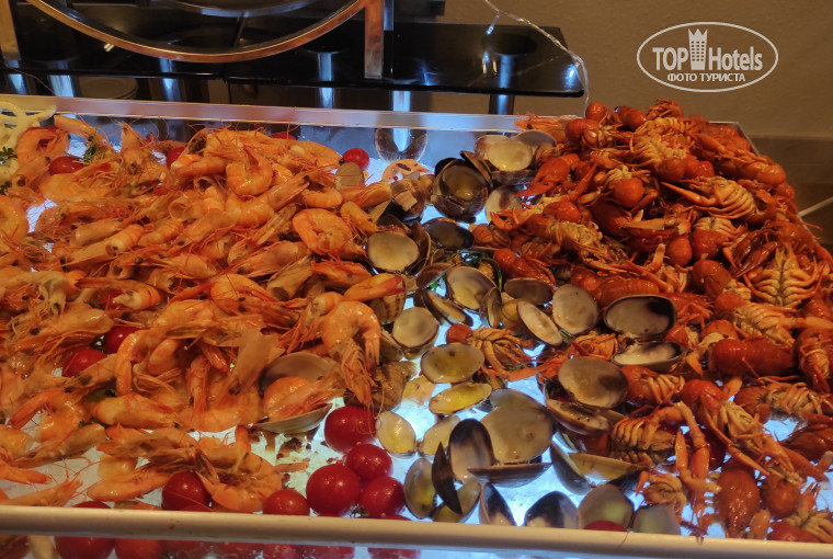 Еда. На обед, ужин всегда была рыба, мясо, курица. Разнообразие полное всего. Официантов много, работаю быстро. Накладывают еду сами отдыхающие, при входе каждому дают перчатки и маску. Свободные столики были всегда, вчетвером в главном ресторане сесть было можно спокойно. Если было желание отдохнуть вечером на открытой части ресторана, нужно было ловить освобождающийся стол, а в помещении всегда можно сесть. Еды море, удивляюсь отзывам людей, которые пишут, что нечего есть, хотелось бы посмотреть, что эти люди дома едят, если им не по душе такое рацион)). Очереди за едой видел за десять дней два раза, когда давали креветок и морепродукты. Для детей детское меню, мои всегда находили, что поесть. Каждый вечер была клубника.