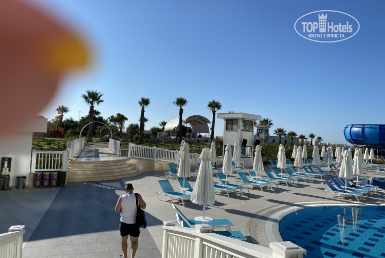 Отель находится в 65 км от аэропорта Антальи, в славном городе Сиде.Скажем так, в пригороде. Пусть Вас не смущает приставка De Luxe в названии. Конечно,это не люксовый отель.Отель построен в 2020, но из-за известных событий полноценно функционирует с 2021. Новый - да, современный - да, есть элементы дизайна.Уместили приличных размеров просторный главный бассейн с мостиком.У бассейнов всегда есть свободные лежаки, полотенца выдают в спа.бассейн с взрослыми горками и для малышей, амфитеатр. Горки работают по расписанию, очереди - минимальные.отдыхает очень много европейцев немцы поляки немного русских , близлежащих стран СНГ, турков.Питание - вкусно, это радовало. Рыба и морепродукты: раки, креветки, мидии, кальмары. Конечно, не подавали лобстеров! Но - это отель не делюкс, это просто хорошая пятёрка в своём ценовом диапазоне! Для любителей мяса - баранина, говядина, курица, индейка, в разных видах. Телятина и язык! Это аппетитно. Что-то жаренное, что-то потушенное.Хороший выбор овощей, сыра, фруктов, булочек на завтрак. Свежевыжатых соков нет. Пляж и постепенный заход в море - шикарно! Песочек, море теплое. Шезлонгов - хватало, никогда не занимали.Про номер хочется сказать - светлый.Водичка без газа, чай, кофе, лосьон для тела, шампуни, гели для душа - все пополнялось ежедневно. Сейф, плазма на стене с русскими каналами, набор для чая/ кофе, минибар - все исправно. Прибирались без претензий.