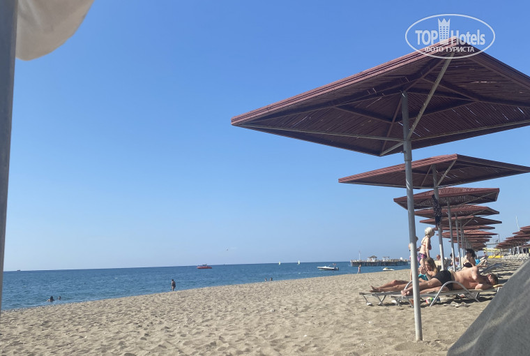 ПЛЯЖ. Песчаного- галечный. Чистый. Лежаки и зонтики. Есть бар , там только прохладительные напитки. Горячий чай и кофе можно получить у тихого бассейна. Из бара играет музыка.