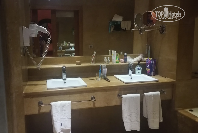 Номер большой (жили 2 взр+ребёнок). В номере большая 2спальная кровать и 2 кушетки, телевизор (есть русские каналы), кондиционер, вентилятор, гардеробная, ванна, душ, много зеркал, по вечерам темно в номерн