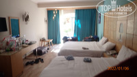 НОМЕР: Наш номер № 4012 находился на первом этаже практически по середине (чуть ближе к морю) правого корпуса и нам понравилось его расположение (не далеко от моря и бара, далеко от бассейнов, и в пару минут от главного ресторана, с отличным видом с балкона на солнечную сторону и зеленую тропинку вдоль корпусов). Номер просторный и удобный (с множеством розеток в нужных местах) и когда-то действительно был очень хороший, но к сожалению, в наше присутствие уже подуставший постояльцами и требующий косметического ремонта. В номере две кровати (одна большая кровать в ширину 1,8/1,9 метра с отличным жестким матрасом, и кровать для ребенка 1,4 м в ширину уже с изношенным матрасом), подушки были средней комфортности, холодильник уже не новый, но не громкий и справлялся со своими «обязанностями», телевизор на стене мы не включали. В номере чайник, чайные принадлежности, в шкафу сейф, в ванной фен, шампуни, мыло, гели (но мы не пользовались, всё что нужно привезли из дома). Мебель в номере уже немного обветшалая, но в рабочем состояние, полотенца для пляжа уже были в номере запакованные в пакете, а вот менять их надо уже самому на пляже. Ключи от номера электронные, на ресепшен без проблем после обращения на следующий день дали второй ключ, просил несколько раз третий ключ для ребенка 12 лет, но так и не дали. В первый вечер не заметили и нас немного покусали комары, но последующие дни начали включать на ночь фумигатор, поэтому комаров в номере больше не было. Воду уборщик нам приносил по две, а иногда и три 1,5 литровых бутылки ежедневно, полотенца меняли по необходимости. Убирались у нас обычно по нашей просьбе через два дня на третий, уборщику давали практически каждый раз по 1$, но и когда и не оставляли на качество уборки это не влияло. При заселении у нас было в шкафу всего две вешалки, но после обращения на ресепшен, сразу же принесли еще три. В нашем номере всегда была горячая вода (с хорошим напором и хорошим сливом хотя душевая лейка уже была изношена) и понравилось, как солнце в дневное время освещало номер, его всегда было в меру! К недостаткам номера отнесу плохую освещенность в вечернее время (темнело в начале января уже 17:00 часов), света явно не хватало (выключатели работают абсолютно не логично), и не доведенный до ума душ, когда его принимаешь вода от брызг разливается через проём по всему полу из-за короткого защитного стекла, но через несколько дней мы как-то приноровились, но всё равно вода попадала на пол, в номере не хватало большого зеркала (в прошлое посещение в мае в аналогичном номере) наверное или раскололи предыдущие до нас гости, или перенесли сотрудники в другой номер, потому что крепления и следы от него остались на стене. В отличие от прошлого нашего посещения (мы жили в шестом корпусе № 6008, где была слышна в номере дискотека из Арабесок до самой ночи из-за чего спать рано ложиться было невозможно) шума в номере по вечерам не было. У нас ничего не ломалось, всё работало, и мы ничего не ремонтировали поэтому за номер отелю ХОРОШО с ПЛЮСОМ.