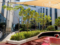 Территории нет, но есть очень красивая зеленая терраса , где завтракают, а вечером курят кальяны. На крыше есть два бассейна, отличные комфортные раздевалки. Лежаки надо занимать, на всех не хватает.