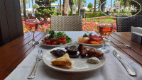 3. ПИТАНИЕ. В отеле 1 главный ресторан и 3 ресторана ля-карте Итальянский и Турецкий (бесплатные) за время отдыха можно посетить каждый (записываться лучше сразу по приезду, так как работают они по определенным дням) и Средиземноморский (платный), во время нашего отдыха не работал, пока не сезон. Еда на завтрак разнообразная яичница, яйца вареные, омлет со всевозможными добавками, блинчики, сосиски, йогурты, колбасы, сыры, свежие овощи, круассаны, всевозможные булочки, пицца, жареный сыр, разные хлопья с молоком. 2 вида каш (часто была гречневая). Из напитков чай, растворимый кофе, турецкий чай, какао, пакетированные соки, свежевыжатый апельсиновый сок. На обед и ужин питание за последние 2 года стало по хуже (читали отзывы до 20 года тогда было много говядины, баранины и морепродуктов), но это не вина отеля, а всеобщая ситуация в стране (в Турции начиная с конца 21г , сильно выросли цены на все и на коммуналку и на проезд, на бензин, а главное сильно взлетели цены на продукты, на некоторые в 3, а то и в 7 раз) и в мире. Еда была вкусная не спорю, но вот разнообразие мяса, рыбы и морепродуктов было маленьким. В обед и ужин на гарнир рис, макароны, картошка, нарезанные свежие овощи. 2 вида супа. Из фруктов бананы, яблоки, мандарины, апельсины, грейпфруты, груши, арбузы, дыни, клубника, киви. Всевозможные десерты, мороженое в ресторане очень вкусное, на обед и ужин бывает всегда 3-4 вида (ванильное, клубничное, шоколадное, лимонное, фисташковое). В ресторане и на открытой террасе столиков достаточно, официанты заказанные напитки приносят быстро и очень внимательные, запоминают кто обычно что предпочитает пить и сразу предлагают. Помимо завтрака, обеда и ужина с 11 до 16 на территории в Кебаб хаус пекут лепешки гезлеме, с разными начинками, так же там можно полноценно покушать. Есть овощи, салаты, суп, фри, десерты, а также при вас на выбор из свежих продуктов приготовят бургер, рыбу, индейку или курицу. Напротив лобби-бара (у входа в СПА), есть витрина-холодильник где с 11 до 18 можно перекусить пирожными, тортиками, булочками и всевозможной выпечкой, попить кофе.